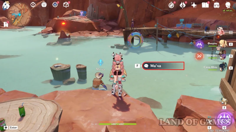 Отправляйтесь к горячему источнику на западе от бушующего вулкана и побеседуйте с сидящим в воде мастером Ма'ча, над головой которого висит голубая квестовая метка.