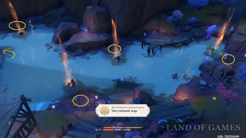 Для получения секретной ачивки «Чистейший жар» (+5 примогемов из набора «Чудеса света») нужно разбить 6 геотермальных отверстий по краям горячего источника и восстановить нормальную температуру воды (их расположение мы отметили на скриншотах с картой и общим планом выше: красные ломаются по квесту, а желтые придется разрушить самостоятельно).