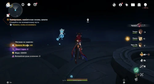 Вы начнете спускаться вниз, а когда прибудете в другую часть горы, снова поболтаете с Амару. На этом задание подойдет к концу. В качестве вознаграждения вы получите 350 очков приключений, 30 тысяч моры, 40 примогемов, 4 книги героя и 4 волшебной руды усиления. Плюс, у вас стартует следующее задание цепочки «В поисках сокрытого сердца».