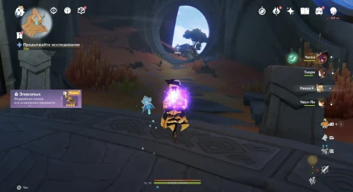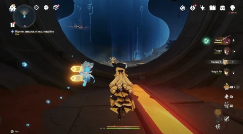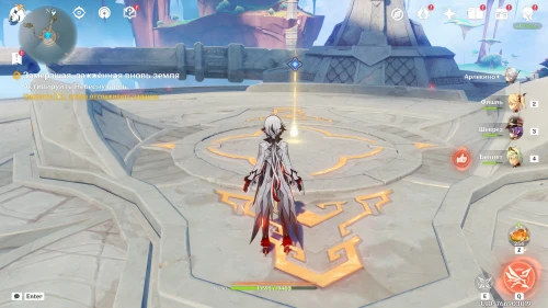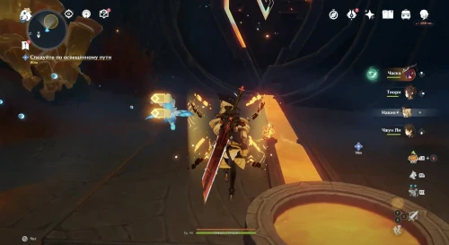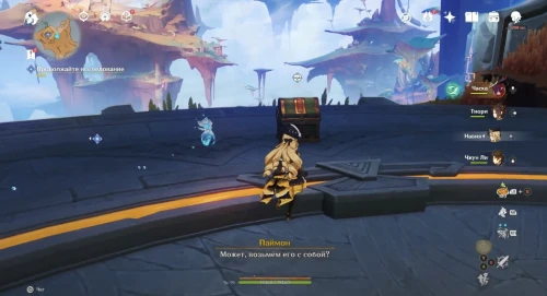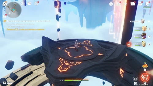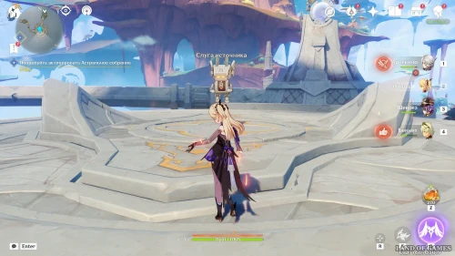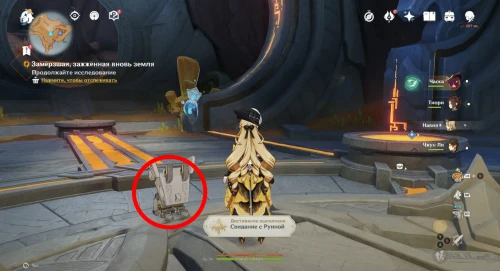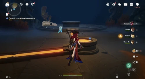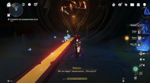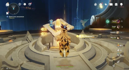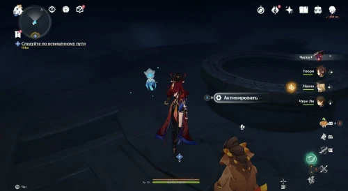 Оказавшись в темном месте, поговорите с Паймон, а потом двигайтесь в сторону иконки, указывающей на неактивированный телепорт. Взаимодействовав с ним, вы увидите, что над головой вашего телепетлизаврика появился восклицательный знак – начните бежать за спутником назад к центральной платформе. Затем подойдите к чаше и кликните по кнопке «Активировать»