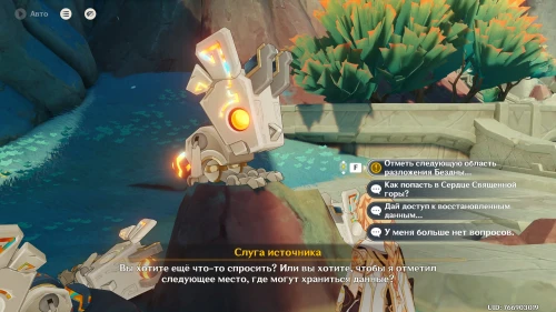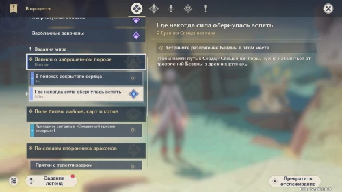 Возьмитесь за прохождение миссии «В поисках сокрытого сердца», а затем пройдите две подзадачи и снова поболтайте со Слугой источника, который все так же будет ждать вас с правой стороны от первого телепорта в глубинах Священной горы. После разговора с ним соответствующий квест автоматически появится в вашем дневнике.