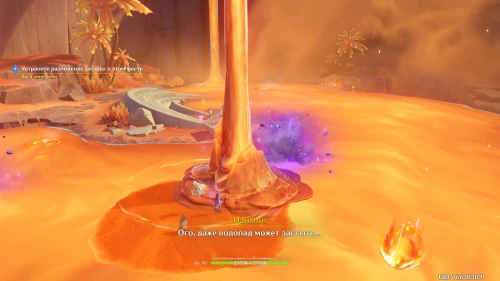 Затем заберите содержимое открывшегося богатого сундучка и встаньте на каменную площадку, на которую полетел слуга источника. Спуститесь вместе с ним вниз во флогистоновый водоем. Продолжайте двигаться за помощником, пока он не подойдет к водопаду и не кристаллизует его.
