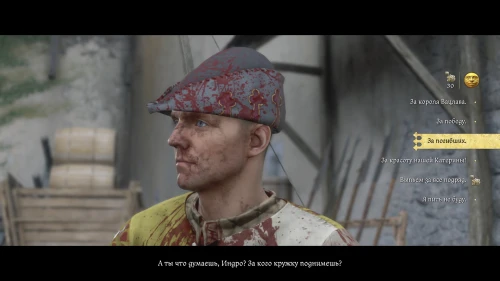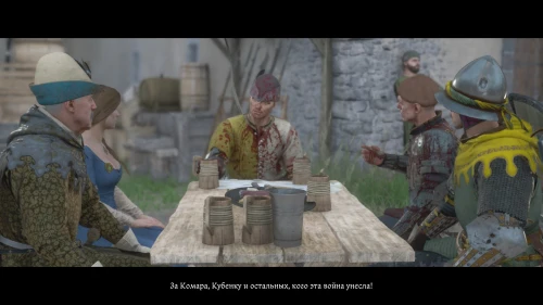 Сухой Черт и остальные будут тоже сидеть во дворе и праздновать победу. Присоединитесь к ним и выберите выпить за погибших, чтобы набрать репутации. Доведите разговор до конца и выйдите из-за стола.