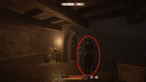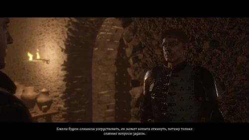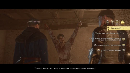 Гинек будет ожидать вас в пыточной, где вы ранее вербовали живодера Вольфрама. Поговорите с Чертом и тот скажет о том, что нужно подобрать вопросы с умом, так как из-за чрезмерных пыток пленник может умереть. При желании вы можете позволить и Сухому Черту самому задавать вопросы.