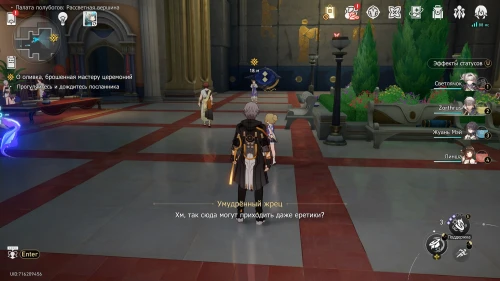 Теперь пройдите направо и поболтайте со жрецом, стоящим чуть вдалеке. В этом помещении тоже можно обнаружить загадки (необязательно) и обычный сундук. После разговора со стариком, пройдите вниз и подойдите к Керкес. Поболтайте с ней, после чего к вам придет гонец, – начните следовать за девушкой.