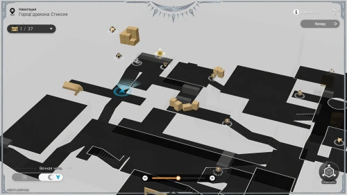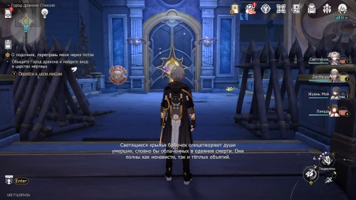 После перемещения в Стиксия бегите вперед по мосту к квестовому указателю. Послушайте рассказ Кастории о бабочках, а потом пройдите через две двери, чтобы попасть в большое пространство с 3D-картой. Поболтайте с призраком торговца впереди. Затем вы встретите Цифер, которая расскажет вам, что видела здесь следы Мидея.