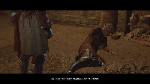 Следуйте налево и зайдите в соседний двор, где будет сидеть пражанин. Он окликнет вас, чтобы поинтересоваться куда вы тащите пленника. Вы легко сможете отвязаться от него, выбрав соответствующую реплику.