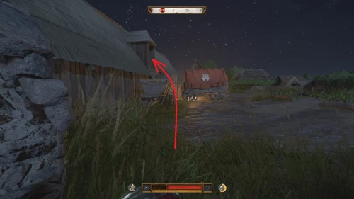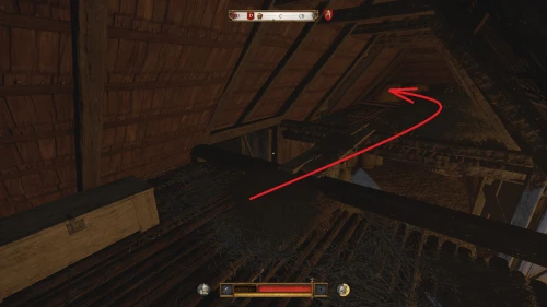 Заберитесь на чердак сарая по лестнице, но будьте внимательны: рядом, за телегой будут находиться двое стражников, которые легко обратят на вас внимание.