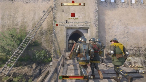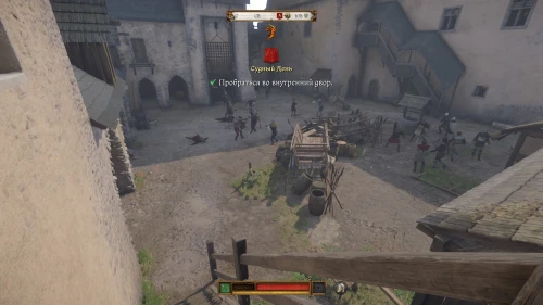 Как только все пражане на вашем пути будут убиты, вам нужно добраться до внутреннего двора и помочь добить оставшихся противников. Следуйте в башню на другом конце стены и спуститесь во двор.