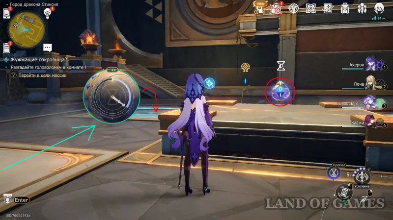В 1-й комнате установлено всего 2 шара: один по центру, а второй — над трамплином в восточном крыле (выше мы указали, в каком порядке с ними взаимодействовать). По середине площадки всегда находится Сосуд времени — артефакт, способный останавливать уже приведенные в движение шары, и проматывать их в обратном направлении силами Оронис. А на западной половина зала находится Киот — подставка с голубой сферой, усиливающая навык перемотки времени.