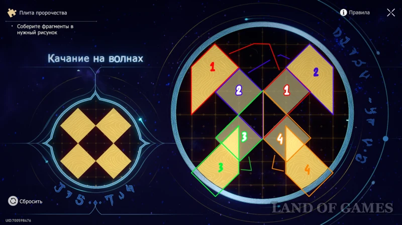 Далее поднимитесь к Плите пророчества на площадке напротив Киота (юго-западный угол зала): собрав рисунок «Качание на волнах» (подсказка с верным расположением элементов на скриншоте выше), вы разблокируете лифт и сможете подняться на второй этаж. Чтобы пройти к шару, примените молитву Оронис на мостике. Далее сломайте опору валуна, обернитесь и повторите перемотку времени для восстановления упавшего участка дороги, а потом спускайтесь на первый этаж.