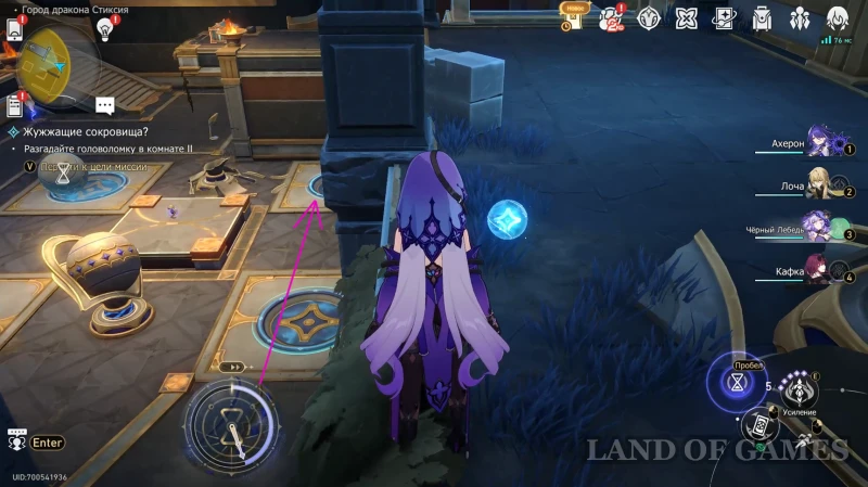 Первым делом сломайте опору валуна, стоящего справа от Киота — он самостоятельно закатится на нужную плиту.