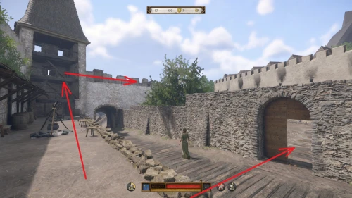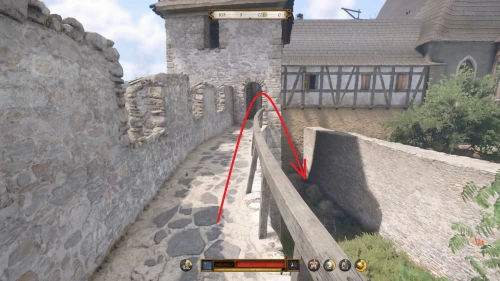 Чтобы обойти Гуго и не вступать с ним в диалог, вы можете воспользоваться башней, отмеченной на скриншоте, и поднявшись по ней, пройти по городской стене. Там, у следующей башни, вы можете спуститься прямо сад, где находится девушка с искомой книгой.