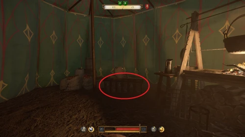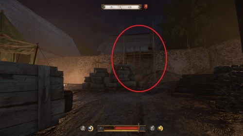 Чтобы покинуть склад, вам придется вернуться к зеленому шатру. Напротив будет находиться лестница, ведущая за стены склада. Подождите, пока стражник, патрулирующий ту часть, отойдет со своего места и бегите наружу.