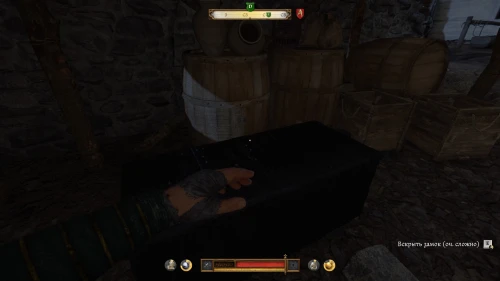 Вино Сигизмунда находится по другую сторону большого здания. Отыщите сундук с замком максимальной сложности, взломайте его и возьмите нужную бутылку.