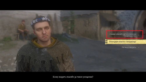 Корректными ответами на вопросы по порядку будут следующие: «Покаяние» > «У простолюдинов» > «Король Вацлав». Только после этого Ченек попросит вас устроить пир для нищих, выкрав еду из склада самого короля.