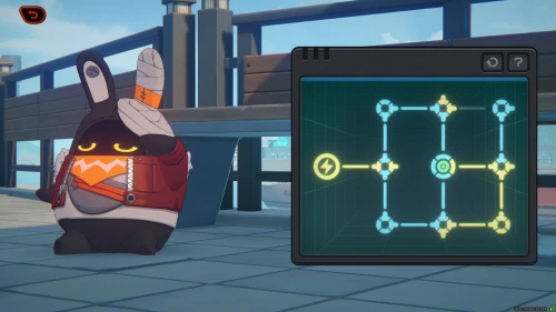 Когда люди убегут, пообщайтесь с Кольцобу, который расскажет вам о своем проблемном друге. Вы согласитесь помочь ему. Бегите к квестовому маркеру и отыщите рядом с ограждением сломанного банбу по имени Цици. Далее вам необходимо будет решить небольшую головоломку с перезагрузкой цепи, правильно поворачивая схемы. На второй картине ниже показано решение.