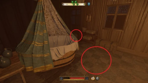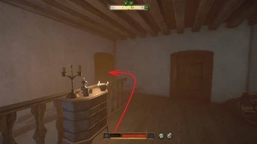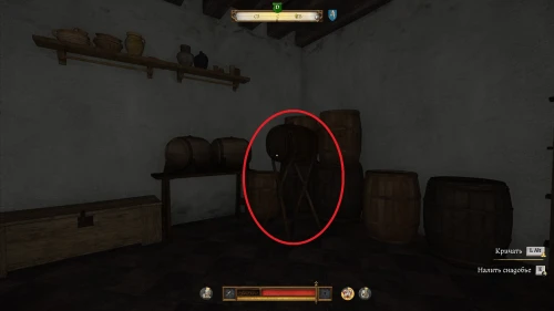 Выйдите из спальни и спуститесь вниз. Все вино будет спрятано в комнате слева за лестницей. Отоприте дверь и взаимодействуйте с бочонком вина стоящим на высоких ножках.