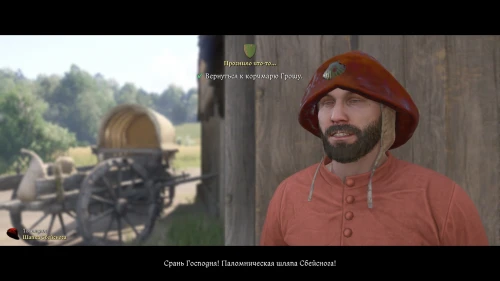 Переговорите с корчмарем и расскажите о выполненном деле. Грош обрадуется полученной шапке бандита и даст вам 150 грошей в награду.
