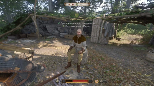 Добравшись до лагеря, бросьте мешок рядом с мешком Карела, а затем переговорите с ним, чтобы получить награду за оказанную помощь. Карел заплатит вам 7 грошей и настоит на том, чтобы вы быстрее покинули лагерь.