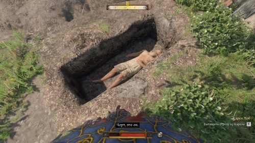 Раскопайте могилу и взаимодействуйте с телом Карела, чтобы выбрать, как именно Индро будет доставать стрелу. Вы можете указать абсолютно любой способ — на квест данный выбор не повлияет.