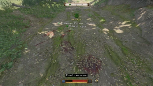 Завершив разговор со Слухачом, отправляйтесь на юго-запад от Биланов к перекрестку, отмеченному на вашей карте. Добравшись до развилки, следуйте по дороге ведущей направо, пока не наткнетесь на лужу крови.