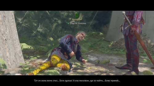 Договориться с разбойниками в лагере у вас не получится. Расправьтесь с ними и осмотрите Микуша, чтобы помочь ему вылечить раны. Пройдите все доступные проверки и обыщите лагерь на предметы помощи.