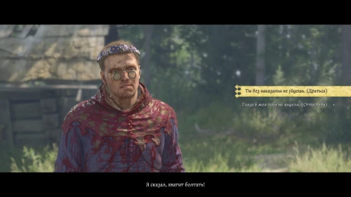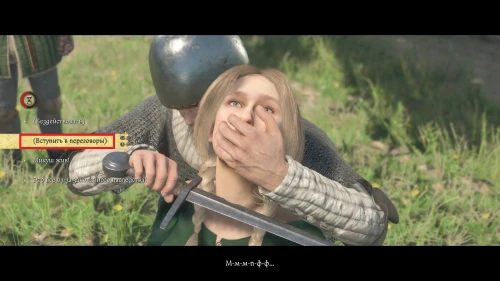 Выбрав вариант (Вступить в переговоры), вам будут доступны несколько проверок. Если вы сомневаетесь в том, что вы их пройдете — выберите последний вариант «Коли отпустишь ее, я тебе заплачу» (100). Ханка отпустит девушку и вы можете поговорить с ним о наследстве и узнать его мотивы.