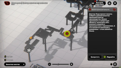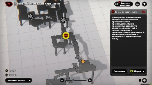 Снова следуйте за указателем, пройдя через открывшийся проход и избегая мин на земле, чтобы не накопить заражение. Не забывайте собирать ресурсы по пути. Поднимитесь наверх по лестнице и расправьтесь с элитным врагом возле лифта. Затем подойдите к первой зацепке на земле. Поднимитесь еще выше и отыщите еще две зацепки.