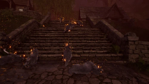 Стоя на площади вы на время потеряете управление персонажем. Небо покраснеет, а с него будут падать горящие собаки. Как только последний пес рухнет на поселение каджитов, вы снова вернетесь к управлению и можете понаблюдать за паникой местных жителей.