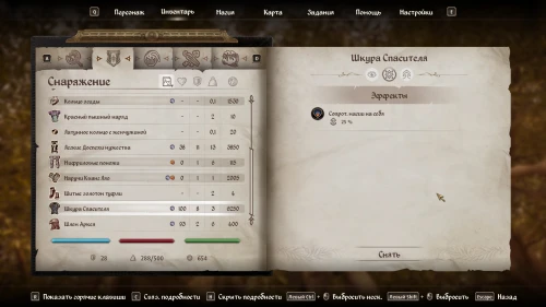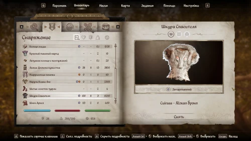 Шкура Спасителя — уникальная легкая кираса с зачарованием на 25% сопротивления к магии. Однако, данная броня будет хороша лишь как дополнение к остальным даэдрическим артефактам. Ее резист к магии в 25% — слишком маленький показатель в сравнении в другими зачарованными предметами, которые вы сможете встретить в игре в дальнейшем.