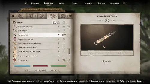 Скелетный Ключ — бесконечная отмычка. Вооружившись данным предметом вы сможете легко вскрывать любые замки, пользуясь автоподбором. Также, находясь в вашем инвентаре, Скелетный Ключ автоматически добавит вам 40 очков к Взлому.