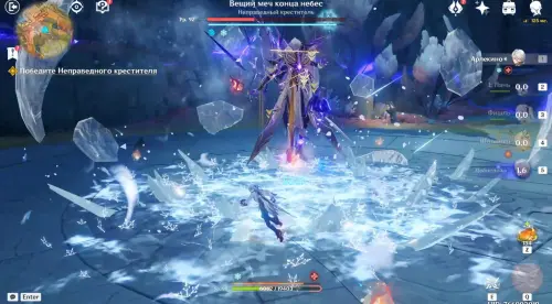 Данный босс полностью аналогичен Чудовищному крестителю. Напомним, что данный противник способен управлять четырьмя стихиями, накладывая на себя соответствующие щиты, однако в рамках одного боя он может использовать только два элемента. В нашем случае ими оказались Пиро и Крио. Используйте другие стихии, чтобы прорвать его щит или просто вызывайте на поле боя Дайна, который без проблем разрушит барьеры.