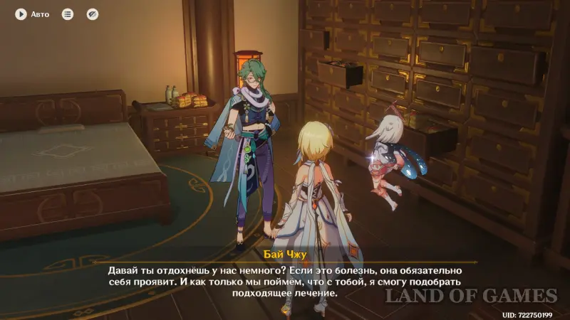 Старый знакомый проведет тщательный осмотр, но не найдет явных признаков недуга. Решив, что проблема может быть в «вне плоскости тела», Бай Чжу предложит немного отдохнуть в хижине и понаблюдать за симптомами.