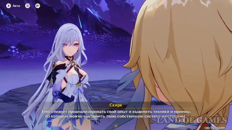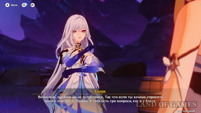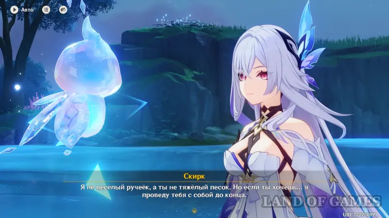 Перед тем как последний раз отправиться в лагерь, обязательно заберите богатый сундук, расположенный у пространственного разрыва. Заключительная часть воспоминаний Скирк, в которой мы будем блуждать без помощи загадочного существа, будет связана с поздним периодом тренировок, путешествием в Тейват и знакомством с Алисой, мамой Кли. А после окончания подготовки, Скирк предоставит ГГ возможность задать ей три любых вопроса.