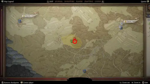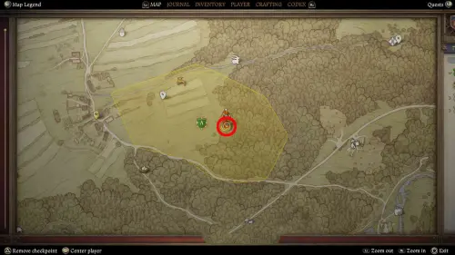 Нужная вам область будет отмечена на карте – она находится между поселениями Висока и Биланы. Так что переместитесь к одной из этих деревень, а затем скачите в сторону маркера. Добравшись до сожженной деревушки, идите в сторону леса, на востоке, пока у вас не появится новая большая выделенная зона.