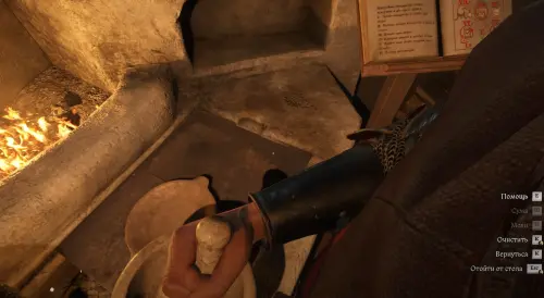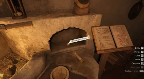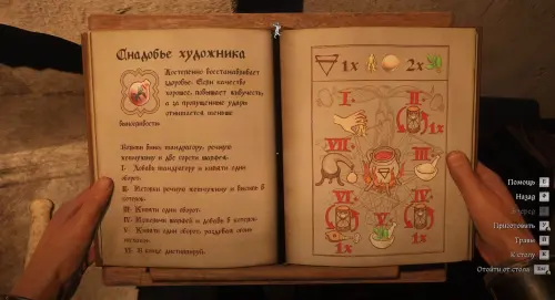 Итак, подойдите к алхимическому верстаку (его можно отыскать в аптеке, в саду которой вы ранее сорвали шалфей). Прежде чем взаимодействовать с ним, обязательно сохранитесь, чтобы в случае ошибки вы смогли легко перезагрузить игру. Теперь посмотрите в книгу рецептов с правой стороны и найдите в ней Снадобье художника. На страничке будет описано, как его приготовить.