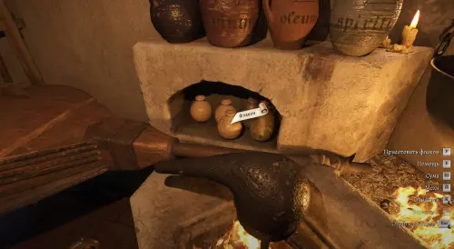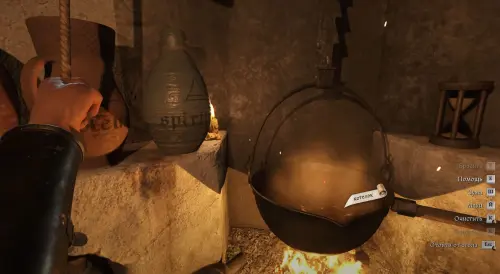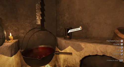 - Измельченный шалфей насыпьте в котелок и снова опустите его на огонь и дождитесь кипенья. После этого переверните песочные часы и начните использовать мехи для розжига пламени (клавиша «Q»). Через 1 оборот поднимите котел.