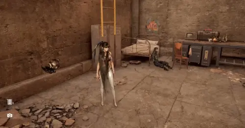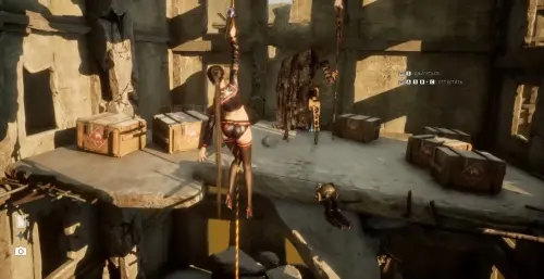 Напротив них будет дыра и веревка, взобравшись по которой вы окажетесь внутри здания. Будьте готовы к сражению с врагом. Разберитесь с ним, затем сфотографируйте рыбу на стене у ящиков.
