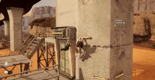 Запрыгните на него и возьмите ящик, сдвинув к выступам, расположенным на стене соседнего здания. Теперь вам нужно забраться на них и преодолеть путь до места с рыбой.