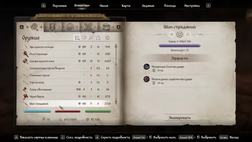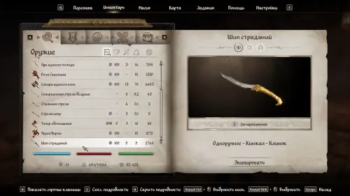 В зависимости от уровня протагониста, данный клинок будет иметь следующие зачарования: повреждение здоровья (5-35) и понижение силы (3-20). Максимальную эффективность Шипа страданий вы получите лишь по достижении 30 уровня.