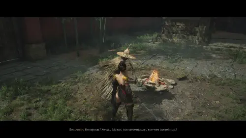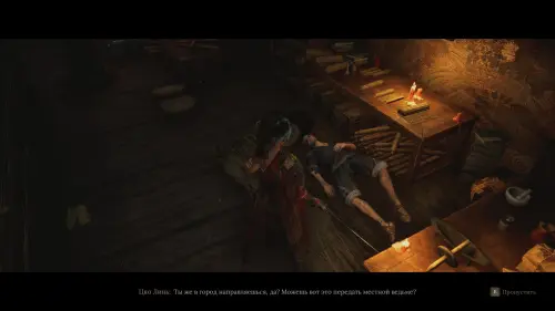После разговора с даосом обойдите комнату и начните диалог с раненным мужчиной. Цяо Линь попросит вас отправиться в город и отнести местной ведьме Амулет из красного дерева, который после диалога окажется в вашем инвентаре.