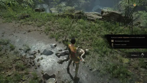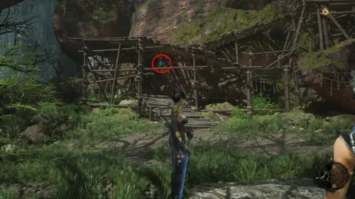 Теперь вам нужно забраться на самый верх горы, поднявшись по деревянной лестнице. На входе будет сидеть птица. Ударьте ее, чтобы получить Золотое перо, дающее Учан временный случайный бонус.