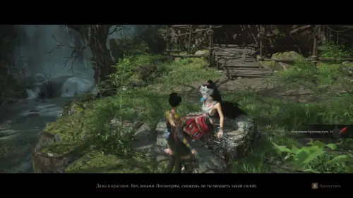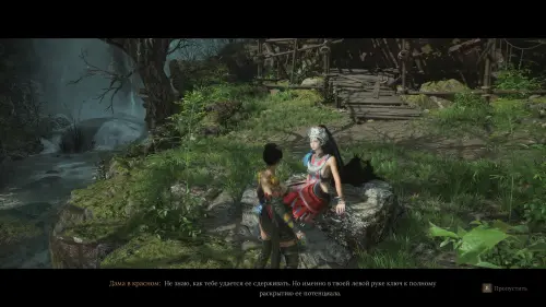 Поднимитесь выше, где у обрыва вы услышите женский голос. Слева у воды будет сидеть Дама в красном. Поговорив с ней, вы получите одну единицу Созревшей красной ртути.