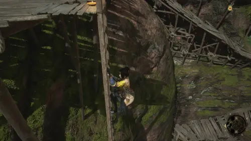 Двигайтесь далее, расправляясь с мелкими врагами, пока не доберетесь до обрыва. Чтобы безопасно спуститься вниз, спрыгните на деревянное бревно и совершите атаку в прыжке на врагов, сидящих внизу.