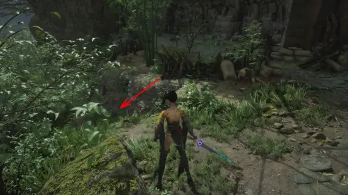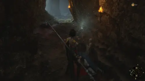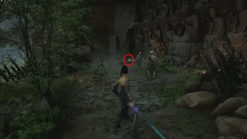 Далее следуйте по правую сторону от выхода из пещеры прямо к стене со скульптурами. Уничтожьте врагов и заберите с тела девушки оружие Копье с красными кистями.