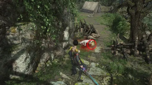 Идите назад и начните спуск с горы по левой тропинке. Немного погодя вы увидите скрытый проход, ведущий влево, к небольшому вражескому лагерю. Забегите туда, чтобы забрать доспех Изящный наряд и остальные расходники.