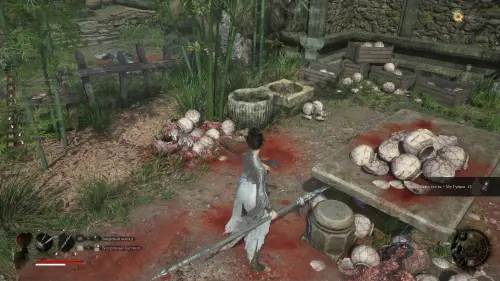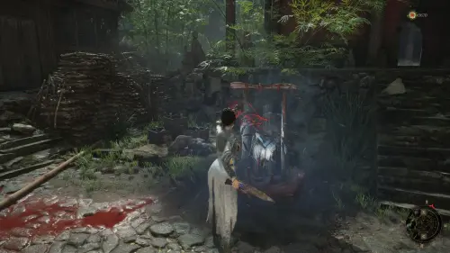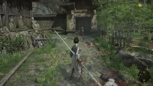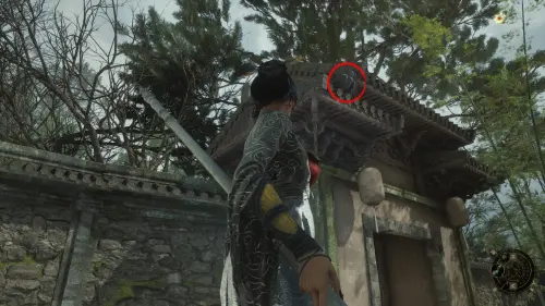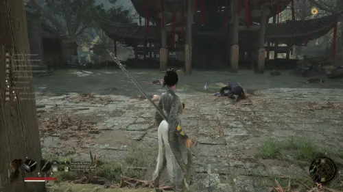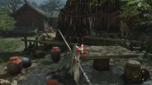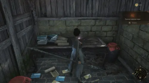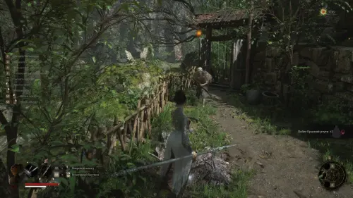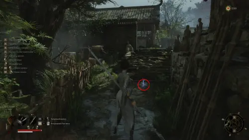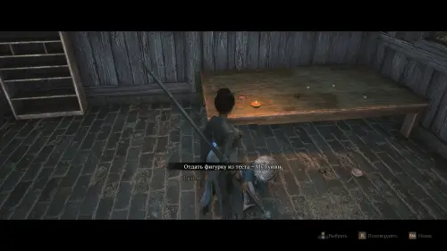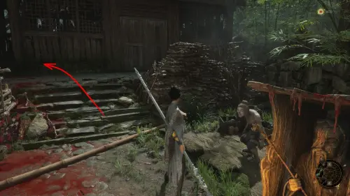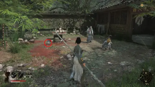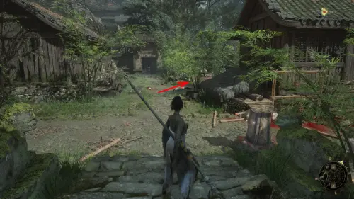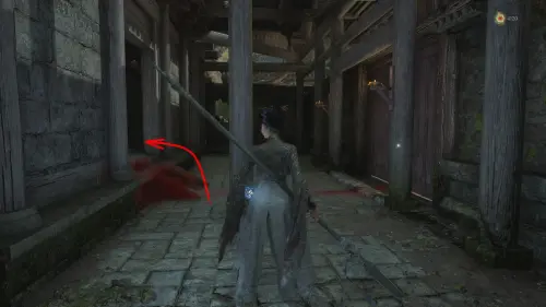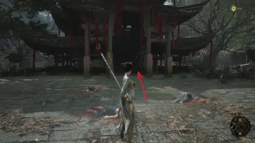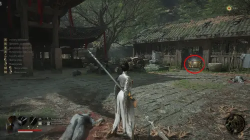Вернитесь к точке перемещения и развернувшись к ней спиной следуйте вперед. Перед тем как идти к воротам на выход, сверните вправо и убейте небольших врагов. Заберите Фигурку из теста — Му Гуйин и зайдите в дом, где на столе будет лежать Тусклое красное перо.