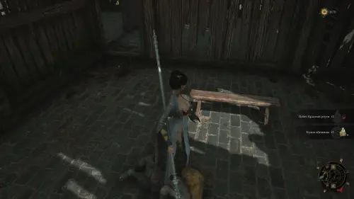 Во дворе храма вы также столкнетесь с большим количеством мобов. Зачистите весь двор с помощью ранее найденной бомбы и заберите со стола новое оружие — одноручный меч Темный лед.