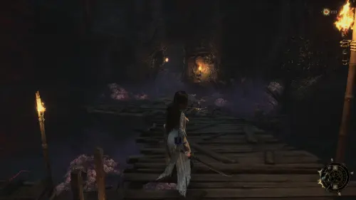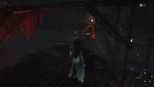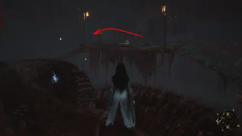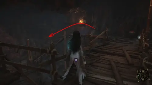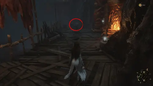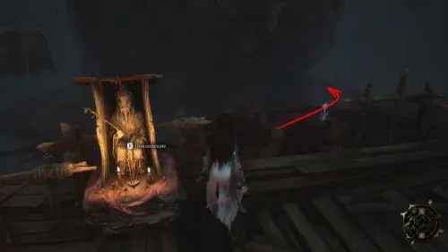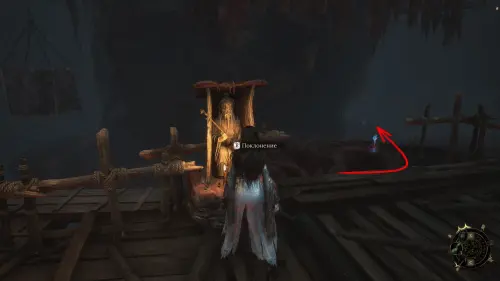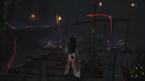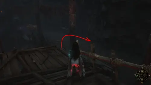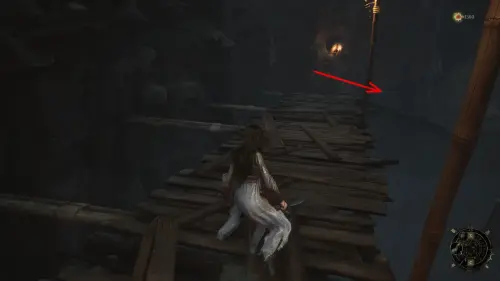 Вернитесь к святилищу и снова бегите по дороге направо. Доберитесь до деревянной платформы, где вы ранее забрали Хлыстовой клинок, и продолжите свой путь по ней.